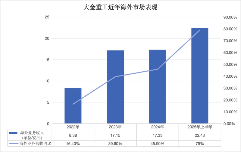 2022年进入欧洲市场后,大金重工的海外市场业绩迎来爆发,公司号称已从“新进者”成为“领跑者”。招股书显示,公司海外市场的营收规模从2022年的8.38亿元增长至今年上半年的22.43亿元,海外市场的营收占比则从16.4%攀升至79%。
