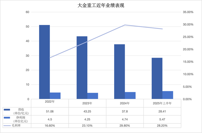 近年来,大金重工的业绩存在一定波动,营收规模呈下降趋势。随着在利润更高的海外市场取得突破,今年上半年公司净利润已超过2022年至2024年每一年的全年净利润。